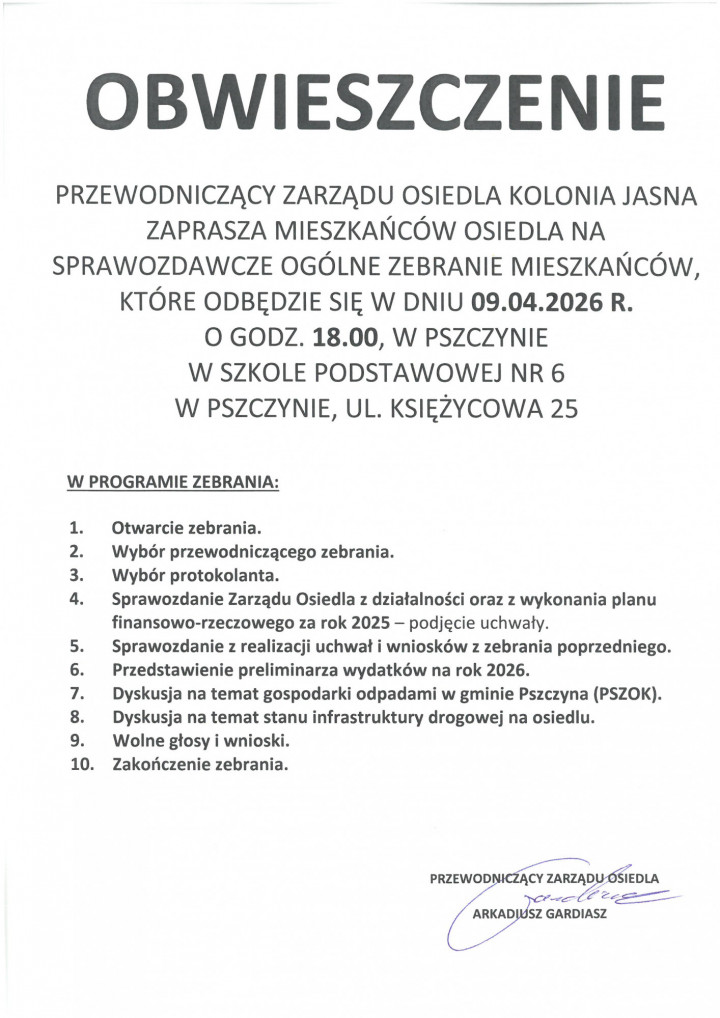 Informujemy, że 9 kwietnia 2026 r. o godzinie 18:00 w Szkole Podstawowej nr 6 w Pszczynie przy ul. Księżycowej 25 odbędzie się Sprawozdawcze Ogólne Zebranie Mieszkańców osiedla Kolonia Jasna.